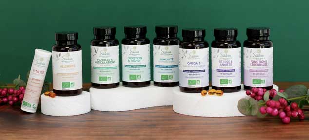 (pour 6 capsules, dose journalière maximale) Huile végétale: périlla bio: 1350 mg. Huiles essentielles: clémentinier petit grain bio: 30 mg, camomille noble bio: 30 mg. livèche racine bio: 30 mg, lavande officinale bio: 30 mg, mélisse officinale bio: 30 mg.